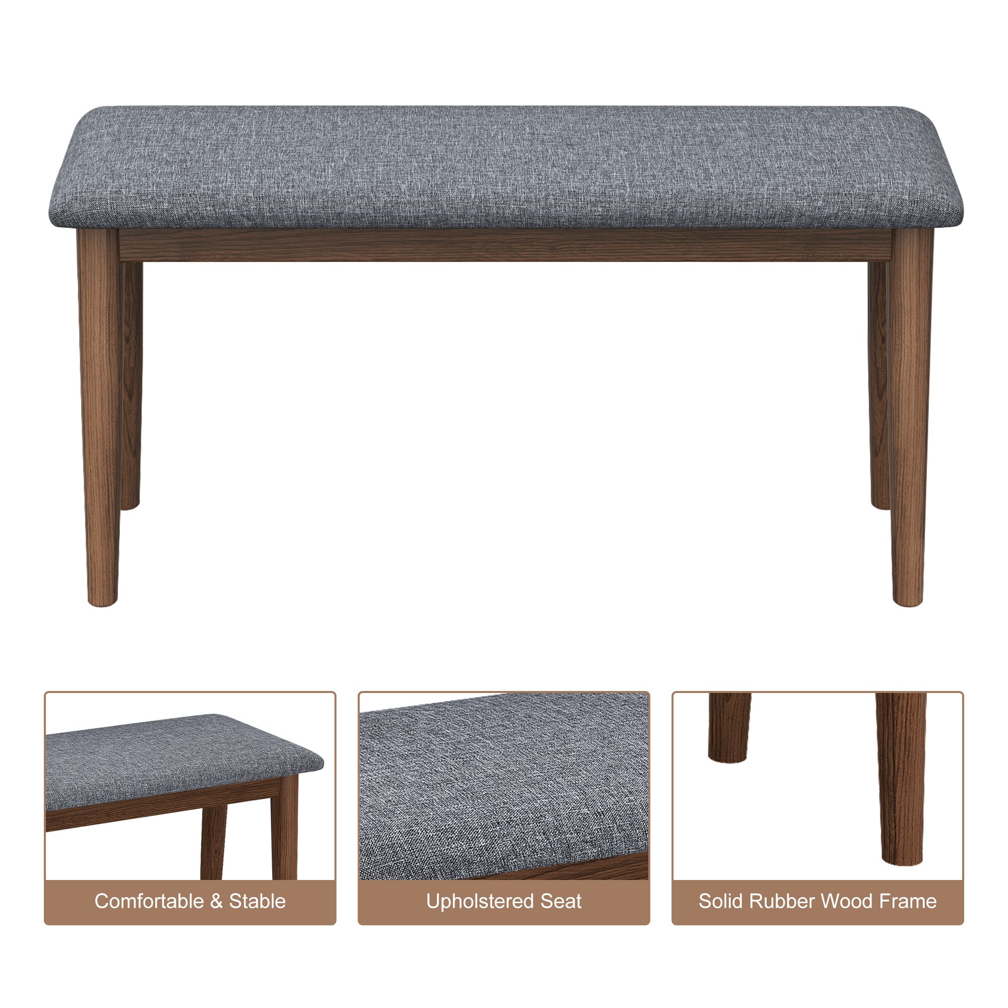 There are 2 pieces benches featuring upholstered seat to ensure comfortable sitting experience. Made of thickened rubber wood and foam, they are soft, scratch and wear-resistant, sturdy, durable and easy to maintain. Retro appearance, classical walnut color and gray cushion perfectly matches any decoration in your house. Match them with a dining table to enjoy dining time with your friends and family!