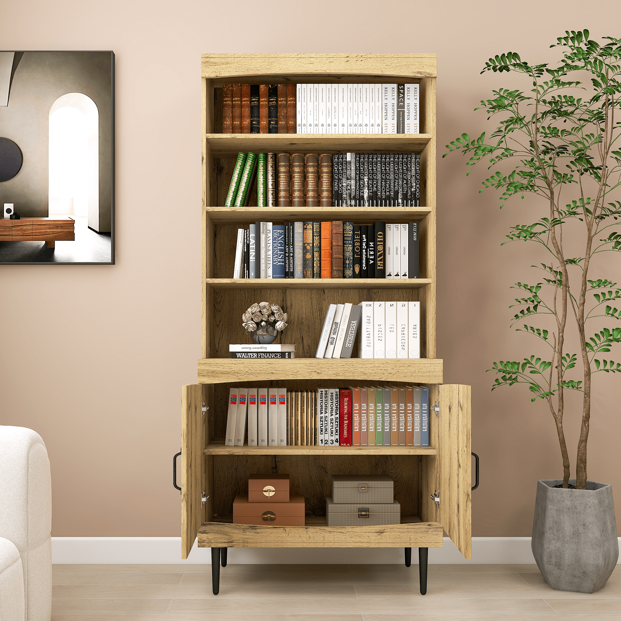 This cabinet is absolutely perfect for your kitchen and dining room. You'll love this kitchen pantry buffet cabinet in a walnut wood finish because of its ample storage design including four levels of open storage shelves, a large cabinet. You can use this storage cabinet as a kitchen pantry cabinet, home storage or coffee bar cabinet.