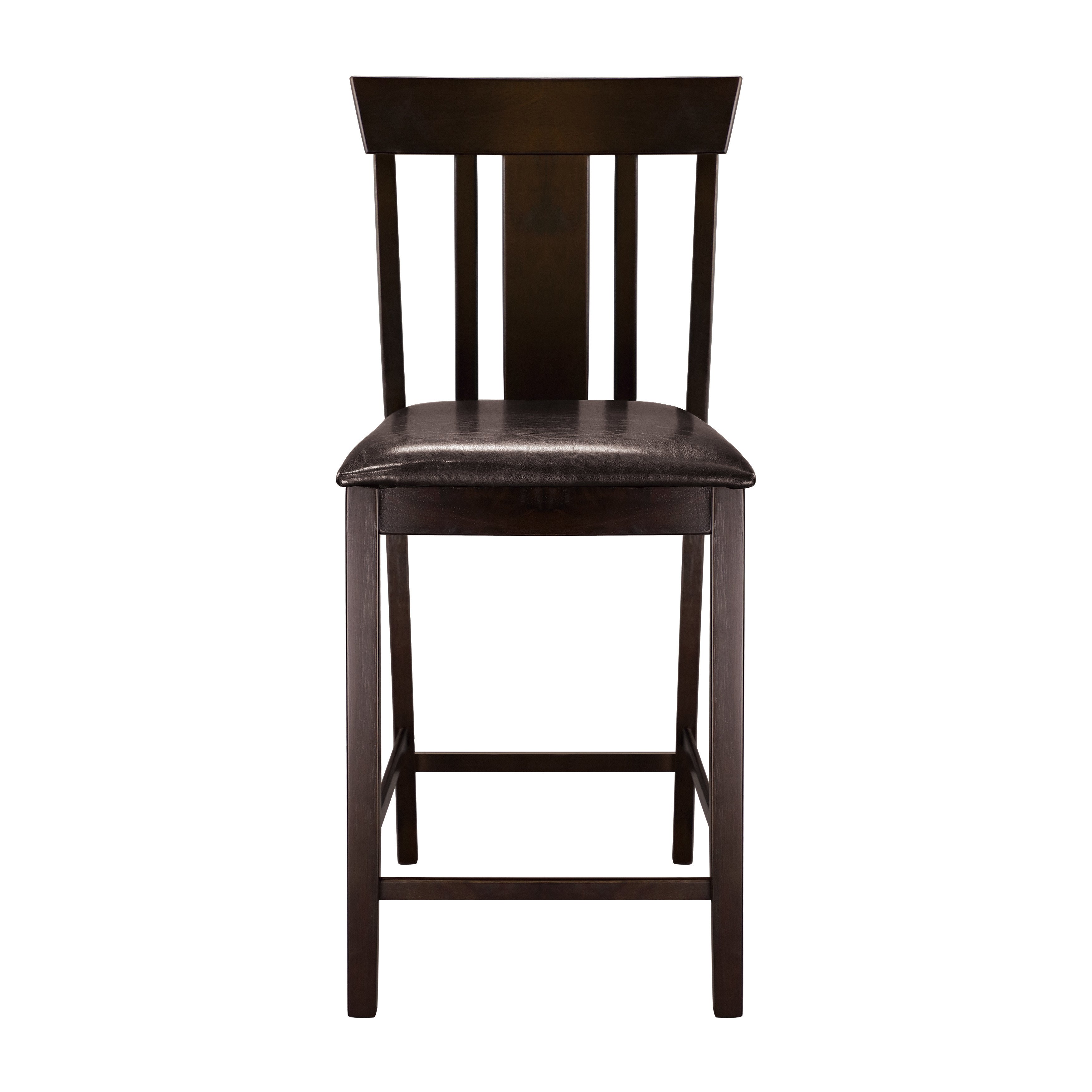 At home in your casual dining space or perhaps in your recreation room, the Diego Collection serves as a casual accent to your home. The birch veneer of the wood-framed chair features a versatile espresso finish, vertical slat backs and padded seats with black faux leather covering.PRODUCT DIMENSIONS: Overall Dimension: 17.25" x 19.25" x 38.75"HSeat Width: 17"Seat Depth: 15.5"Seat Height: 24.75"Listing Includes: Set of 2 Counter Height Chairs Only.Table: Not included.Simple Assembly Require.