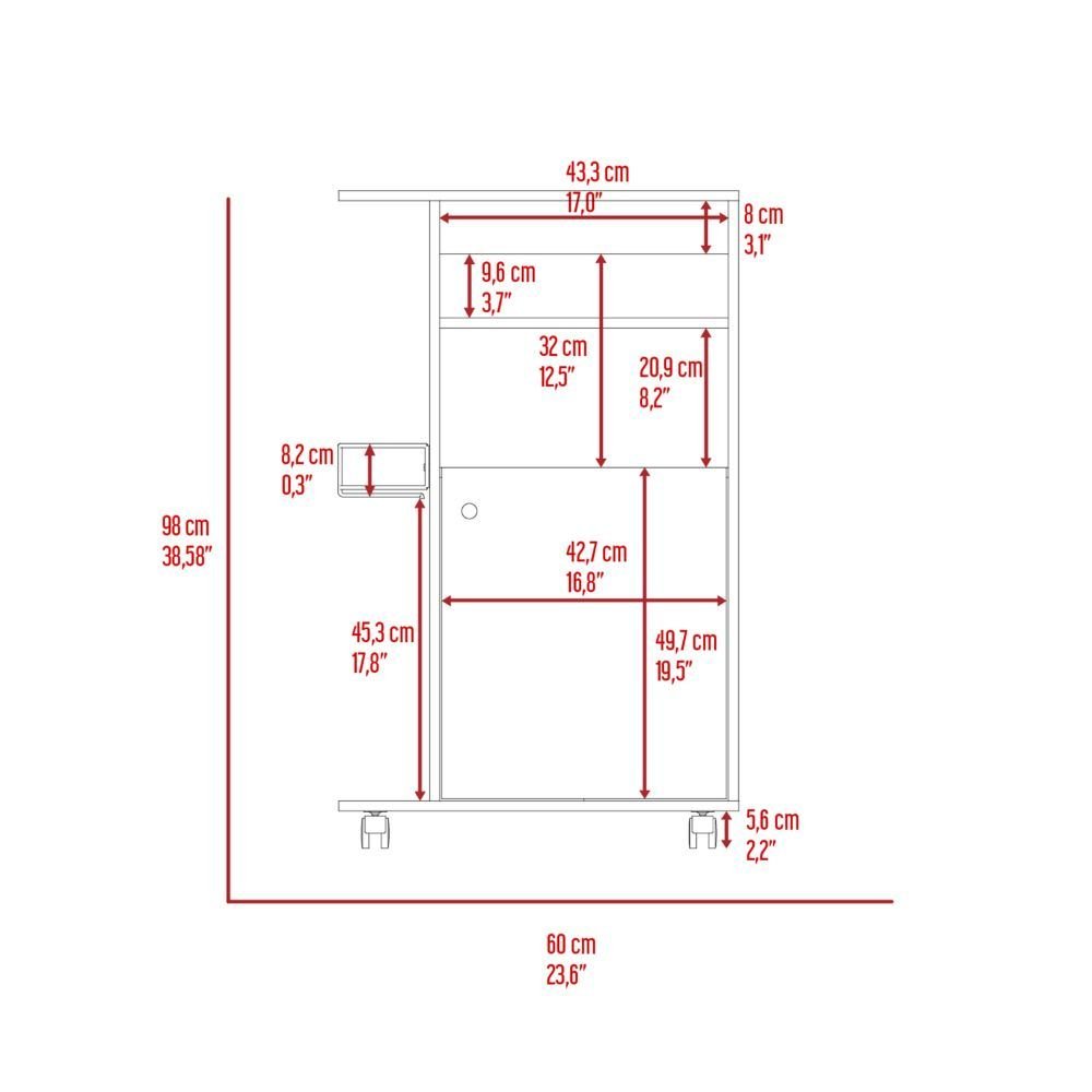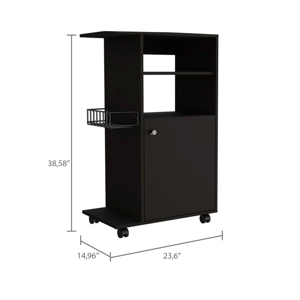 The idea of adding extra storage to your kitchen is entirely possible with this ergonomic cart. Its Countertop is ideal for the microwave; plus; with the ease of its four caster wheels(2; 2'') it is possible to accommodate it in the place you prefer and move it when necessary; and it has ample storage space; elegant and versatile.; with a rack for extra storage (0.3'')Ideal size (38; 58''H X 23; 6''W X 14.96''D) black engineered wood finish.
