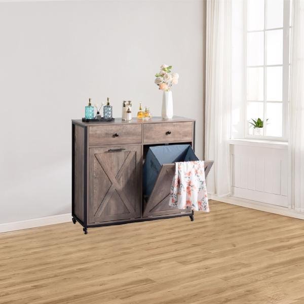 [FCH] Kitchen Trash Can Cabinet, 2 Doors 2 Drawers 2 Dirty Clothes Bags Garbage Storage Cabinet, Gray Wood
